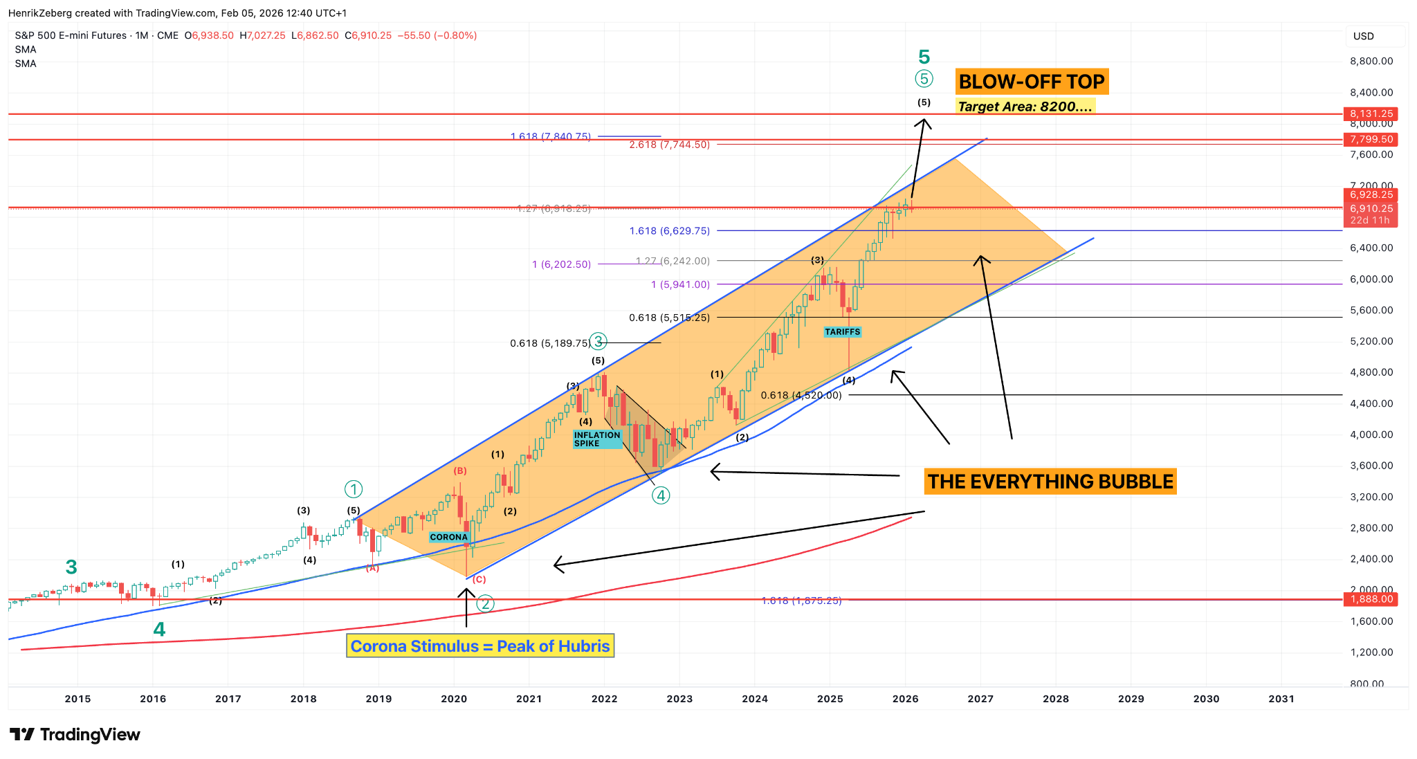 Chart 1: The S&P 500’s extended bull market since 2009, fueled by easy money. Despite occasional jolts (e.g. the 2020 crash), the uptrend never saw a full reset. A final blow-off top toward the ~8,200 area is now on the table as the potential climax of this long cycle.